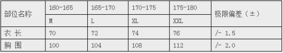 中國衛生男、女式針織短袖T恤衫號型按GB/T 1335.1(男子)規定執行。見下表規定:
