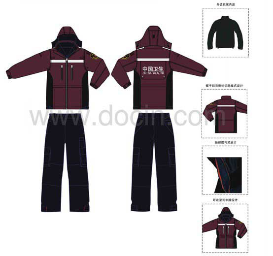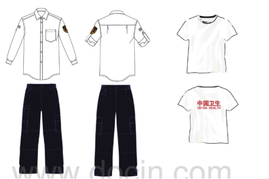 “中國衛生應急服裝”是由冬裝/春秋裝、馬甲、夏裝、圓領衫、戶外帽、戶外靴、臂章等幾部分組成。