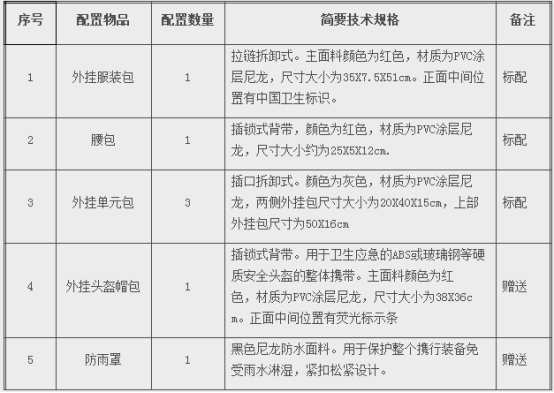 在主箱體正面和前側服裝包的正面印有中國衛生專用標識,主箱體正面設計有魔術貼,可以根據使用單位需求靈活粘貼單位名稱或隊伍類別。