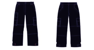 褲子——采用深藏藍(lán),褲口緊縮式設(shè)計(jì)。膝蓋處采用橫向分割,口袋采用外突出立體設(shè)計(jì),增加野外使用的舒適度。