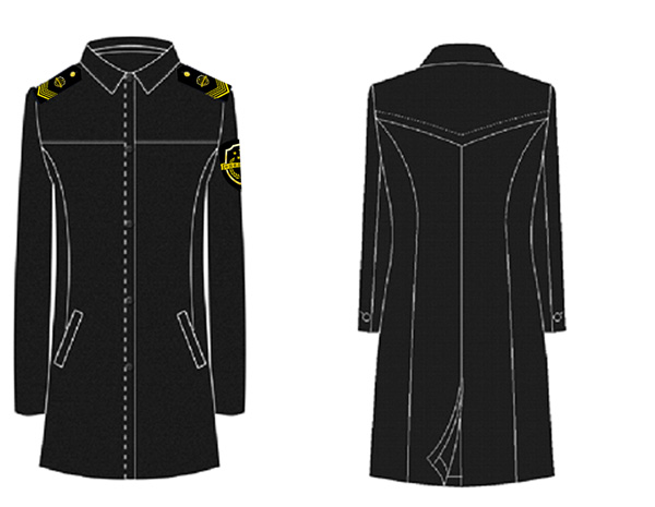 說明:春秋服、冬服均為毛滌混紡面料,顏色為黑色。上衣為小翻領西服式樣,單排三粒扣,兩個暗口袋;西褲為簡褲。